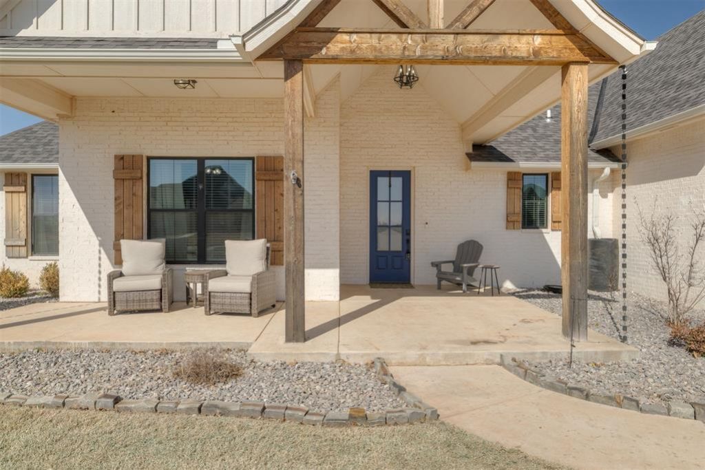 Built in 2021, this modern farmhouse in the established and highly desirable Ashley Oaks neighborhood offers the perfect blend of charm, function, and thoughtful upgrades - all situated on .76 acres in Edmond with Logan County taxes and Deer Creek Schools.With 2,780 square feet, 4 bedrooms downstairs, a large upstairs bonus space (with full bath), 3.5 bathrooms, and a 3-car garage, this home was designed for both everyday living and effortless entertaining.From the moment you arrive, the curb appeal stands out - cedar beams, a spacious covered front porch, and a long concrete driveway leading to a fully fenced, usable property. Ashley Oaks maintains neighborhood standards through an HOA while still welcoming attractive shops.Inside, beautiful wood-look tile flows throughout the main living areas. The living room features built-in surround sound speakers, floor-to-ceiling shiplap surrounding the fireplace, perfectly complementing the kitchen vent hood. Large picture windows overlook the expansive backyard, filling the home with natural light.The kitchen is the true centerpiece, offering a large island with sink and bar-top seating, commercial-grade ZLINE gas range/oven combo, ample countertop space and a huge walk-in pantry with floating shelves, butcher block workspace with added electrical for a coffee bar.The primary suite is privately located on one side of the home and features dual vanities with separate sinks, freestanding soaking tub, large walk-in closet, and direct access to the laundry room for ultimate convenience.The mud area is thoughtfully positioned near the garage entry and laundry room, with stairs tucked privately toward the back of the home leading to a large upstairs bonus room and full bath - ideal for a guest suite, media room, or additional bedroom.Additional upgrades include saltwater softener system, RO system in kitchen, in-ground storm shelter in garage, extended concrete patio, and hot tub.