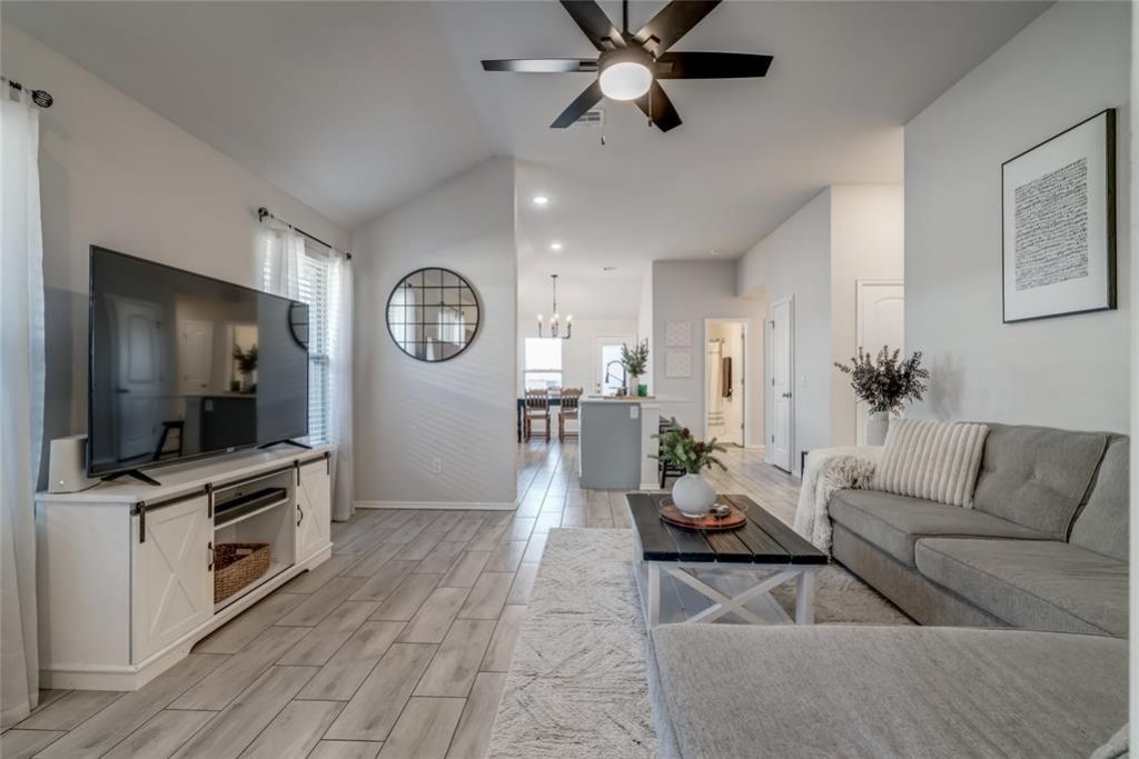 This Charming home was built in 2022 and is better than new! The many seller upgrades include custom blinds, privacy fence, garage door opener, tankless hot water system, modern light fixtures, and sleek hardware that finish off the kitchen and bathrooms perfectly! The Living/dining is an open-concept lifestyle, perfect for entertaining and gatherings. The main living space features modern wood-look tile flooring, while plush carpeting adds comfort and warmth to the bedrooms. The kitchen features modern cabinetry, subway tile backsplash, Samsung stove with 4 burners /built-in griddle, Samsung refrigerator, and a large quartz topped island that overlooks the dining and living areas. The primary bedroom has a full en-suite bathroom, and a spacious walk-in closet. There are two additional well-appointed bedrooms, and a second full bathroom. Additional features include a convenient two-car garage and energy-efficient systems, ensuring both comfort and sustainability. Residents of this vibrant neighborhood enjoy access to top-notch amenities, including a clubhouse, gym, pool, and playground. Whether you're looking to stay active or relax with friends, there's something for everyone. Book a showing today! **VA loan is assumable**